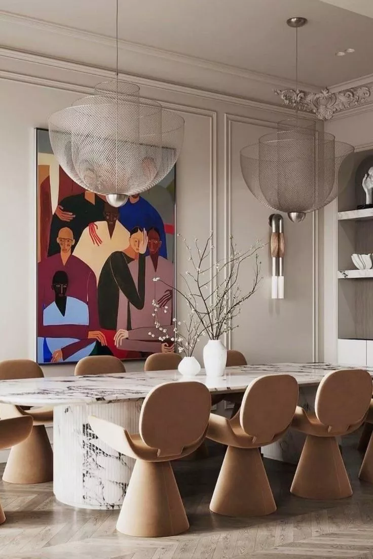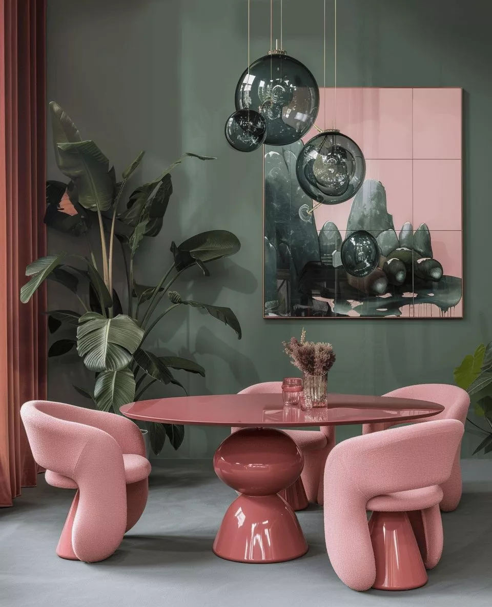 Chroom voegt een moderne, glanzende toets toe en wordt vaak gecombineerd met zwart of glas. Denk aan stoelpoten, tafelframes of verlichting met strakke, geometrische vormen.