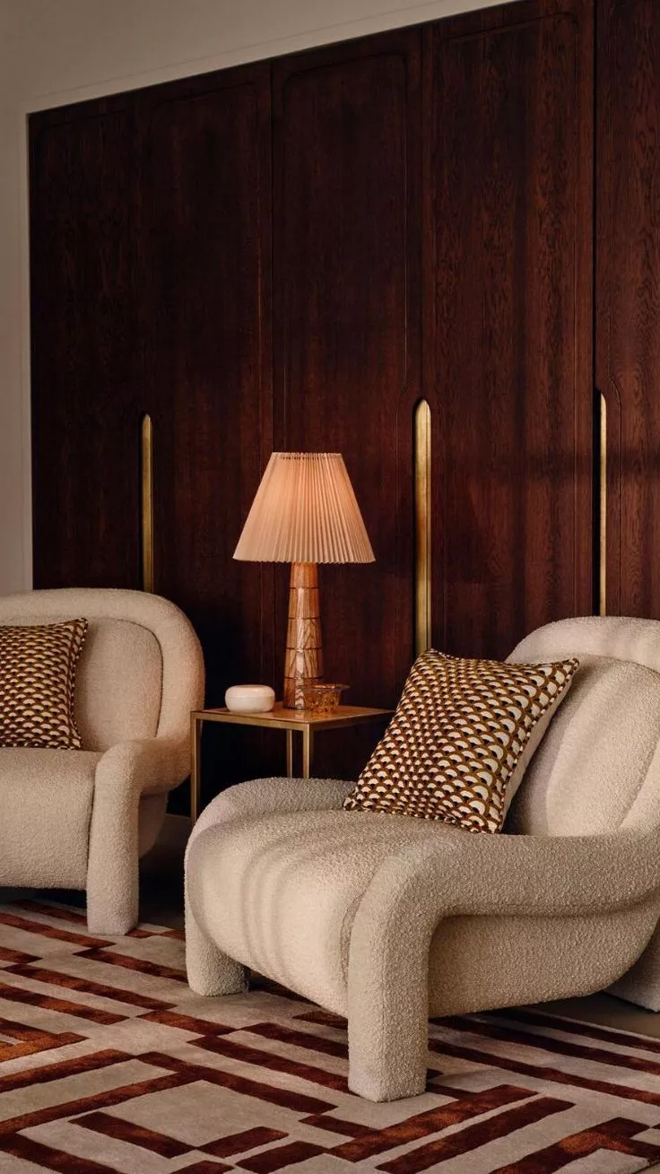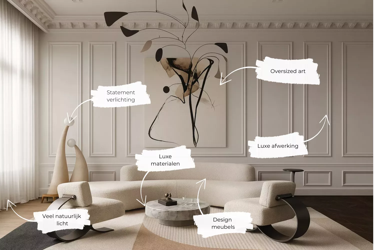 Het idee is om het gevoel van een luxe hotelkamer na te bootsen, maar dan met een persoonlijke twist. Stel je bijvoorbeeld een zithoek voor met een velvet bank, gouden bijzettafeltjes en een marmeren salontafel. Lekker luxe, maar toch huiselijk.