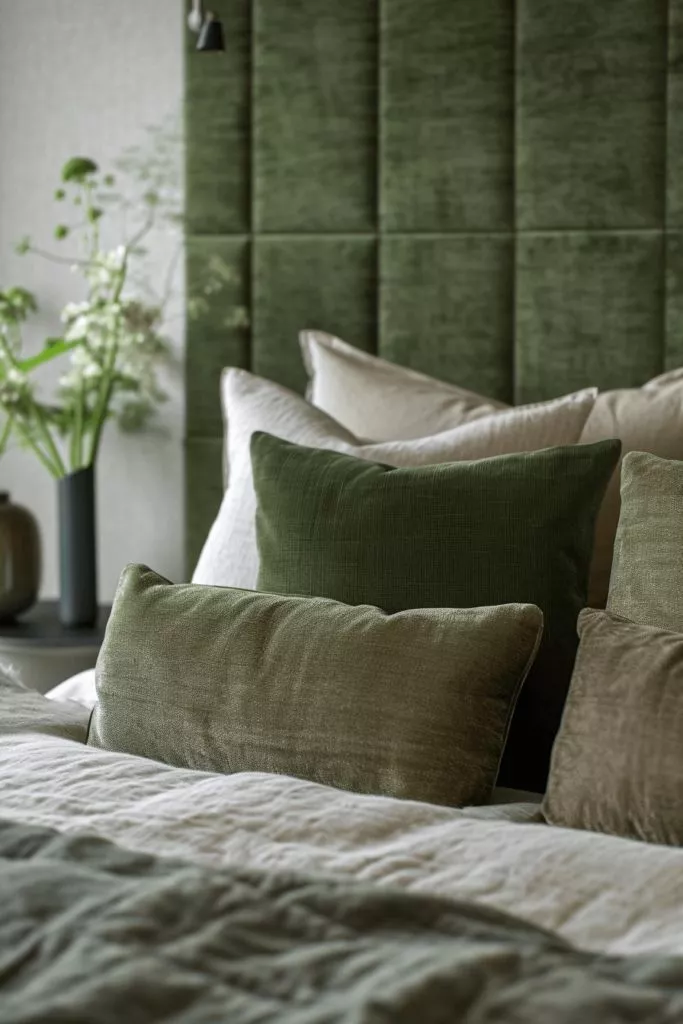 Rijke, diepe kleuren: naast de neutrale basis kun je met diepere kleuren contrast en luxe toevoegen. Deze rijke kleuren kun je subtiel toevoegen via accessoires, kussens, grodijnen of kunstwerken. Wil je toch wat meer statement? Schilder dan de hele kamer in één rijke kleur. Inclusief plafond.